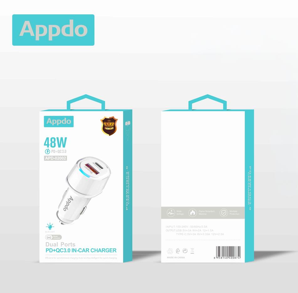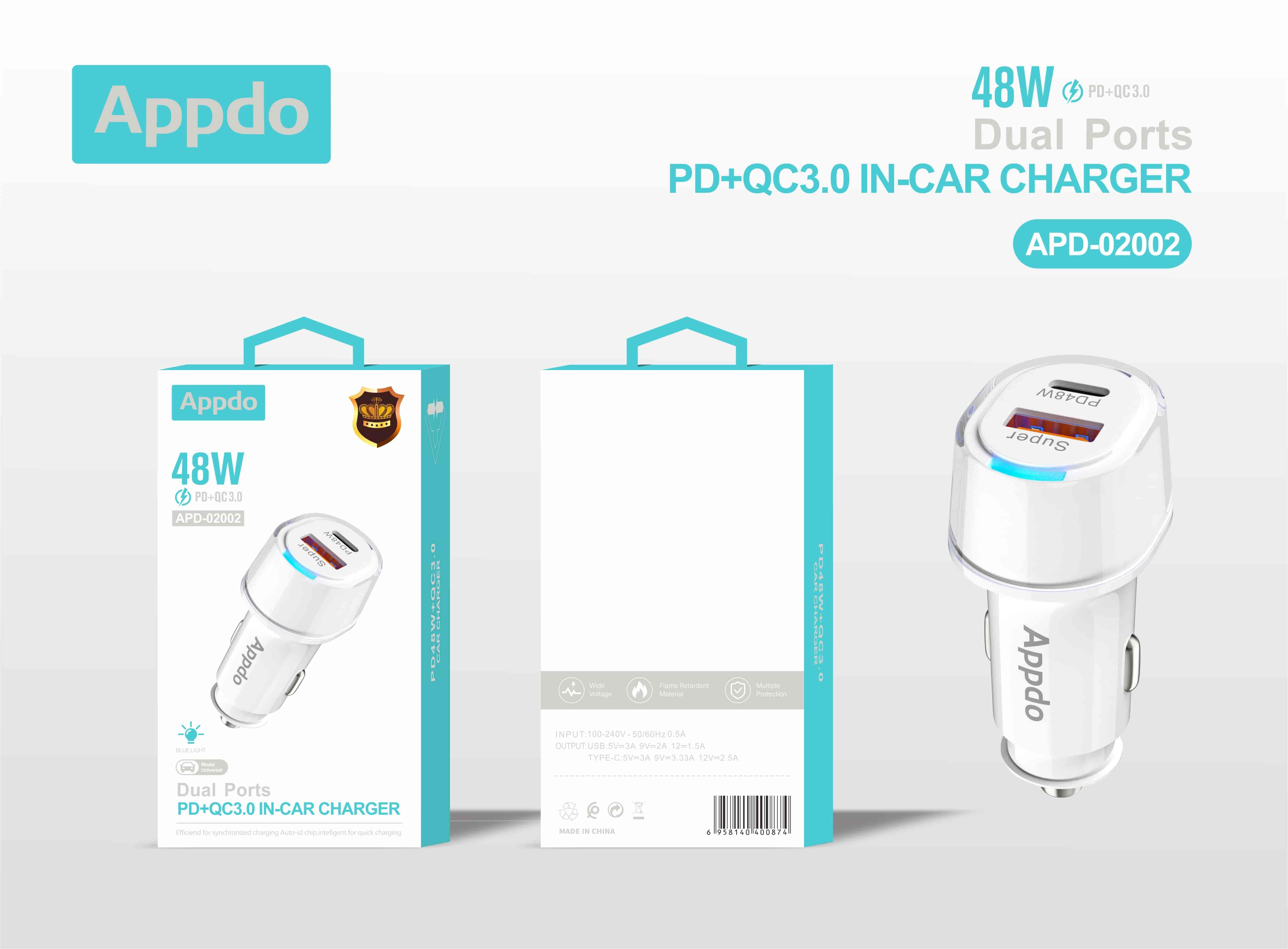 HOME > Products > Chargers > Car charger APD-02002 Car charger Name:Car Charger Output plug:PD/USB Input:12V-24V Output(PD):5V=3A,9V=3A,12V=2.5A Output(Qc3.0):3.6-6.5V=3A,6.5-9V=2A,9-12V=1.5A Product packaging :Welcome to consult We welcome inquiries about brand franchising and partnership opportunities. Submit Back Top